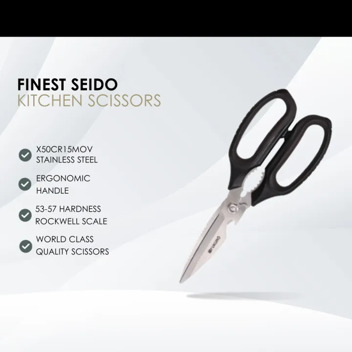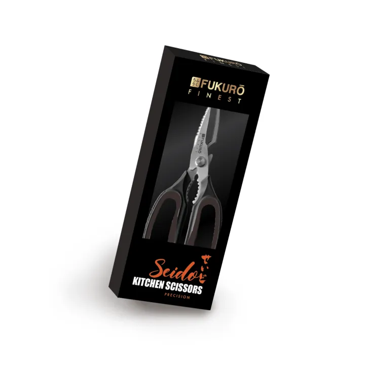 • Fukuro Finest Seido Kitchen Scissors is a must have tool for any kitchen. It is designed to make food preparation a breeze, with sharp stainless steel blades that cut through meat, vegetable and herbs effortlessly. The ergonomic handles provide the perfect grip. Whether you are trimming meat, snipping herbs or just cutting a food packaging, this kitchen scissors is both reliable and functional.